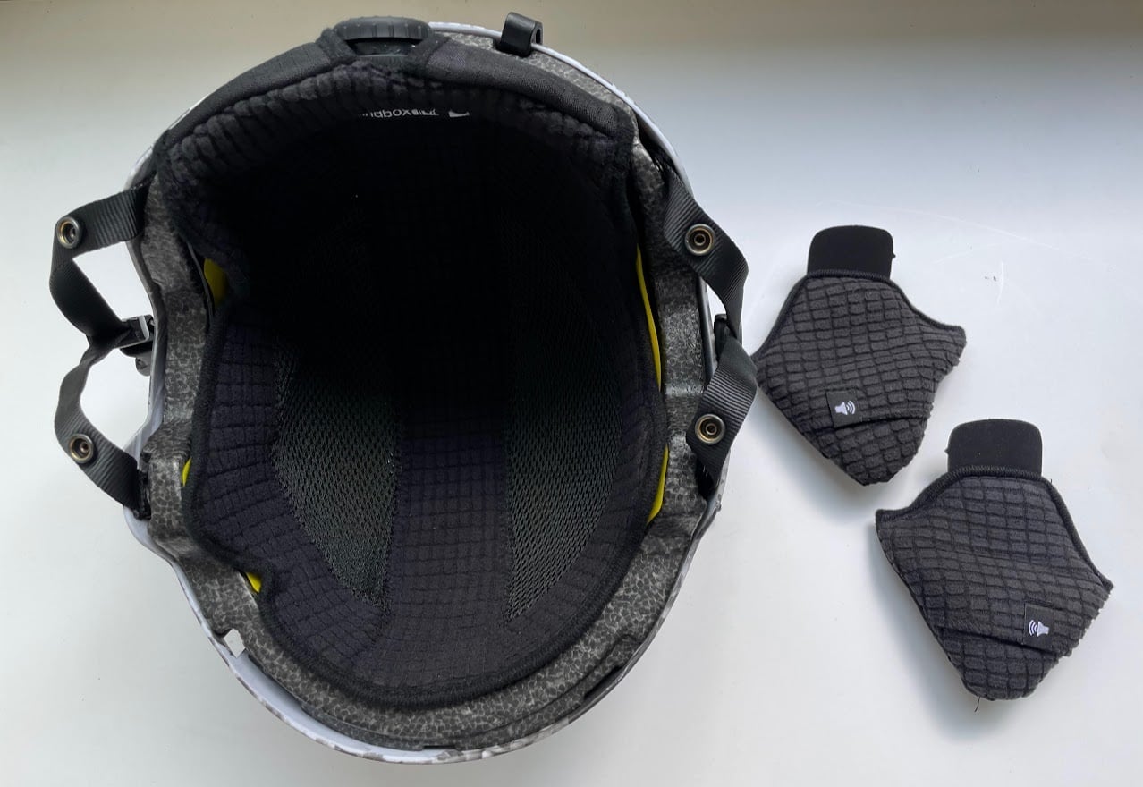 イヤーパッド側にあるあご紐とを結ぶ三角形を描くような頂点についているサイドアジャスター。このアジャスターで三角形の紐の前後のバランスを変化してみると、ヘルメットのかぶりの角度が調整できます。前面を上がるように調整すれば、ゴーグルへの干渉を回避できます。また後ろ気味にかぶることにより、素敵なビーニーの色を見てほしいあなたには嬉しい機能です。
